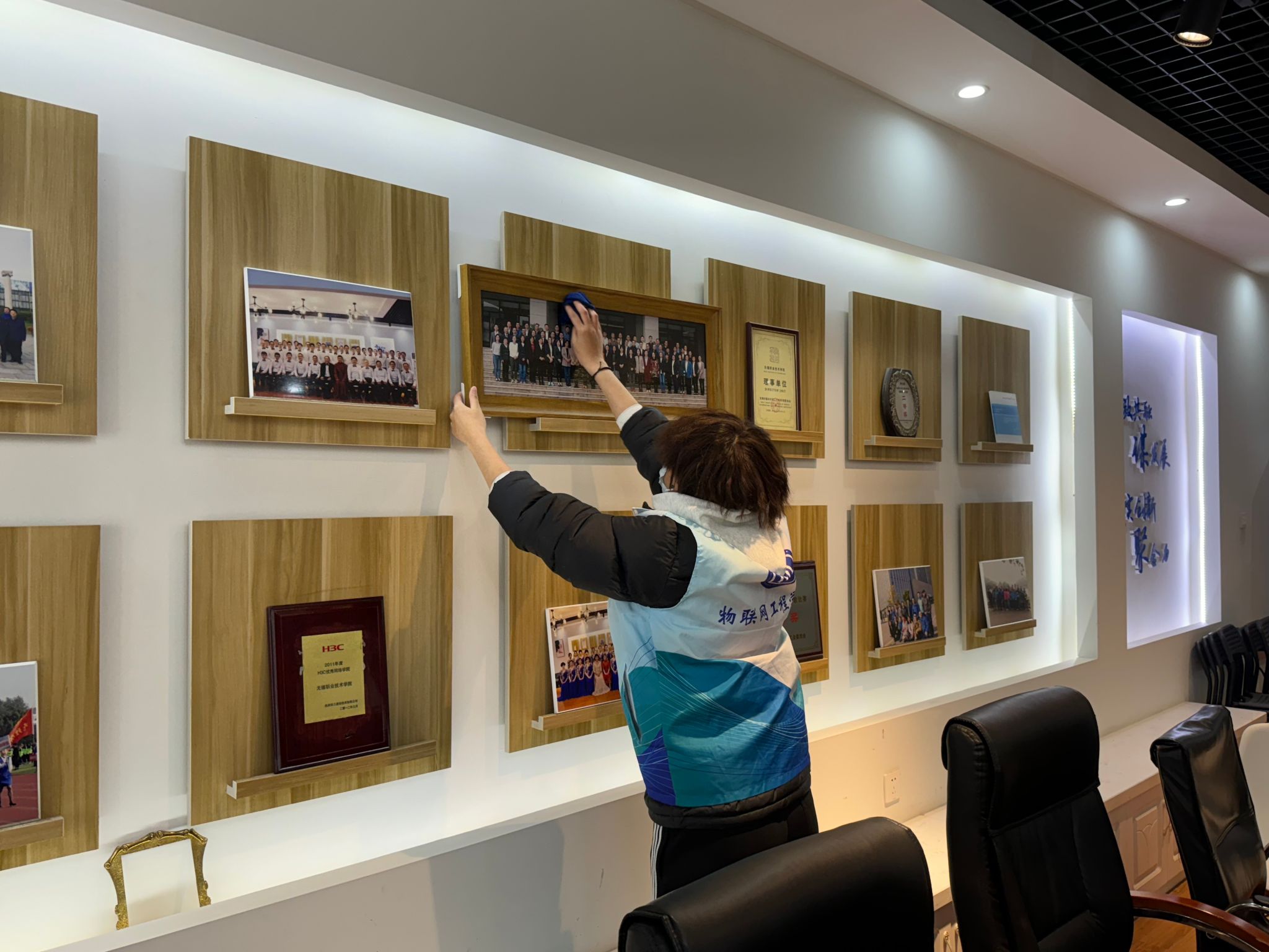 活动伊始,志愿者们迅速集结并有序分组,分别前往会议室及学院公共区域,展开了一场别开生面的校园“焕新”行动。在会议室,志愿者们化身为校园环境的守护者,他们手持抹布与清洁剂,全神贯注地投入到清洁工作中。从桌面的水渍到墙角的蛛网,每一个细节都经过他们的精心擦拭与清理,最终使会议室焕然一新,为师生们营造了一个整洁、舒适的会议环境。
