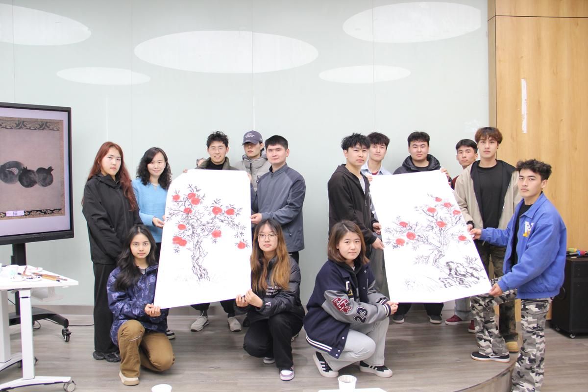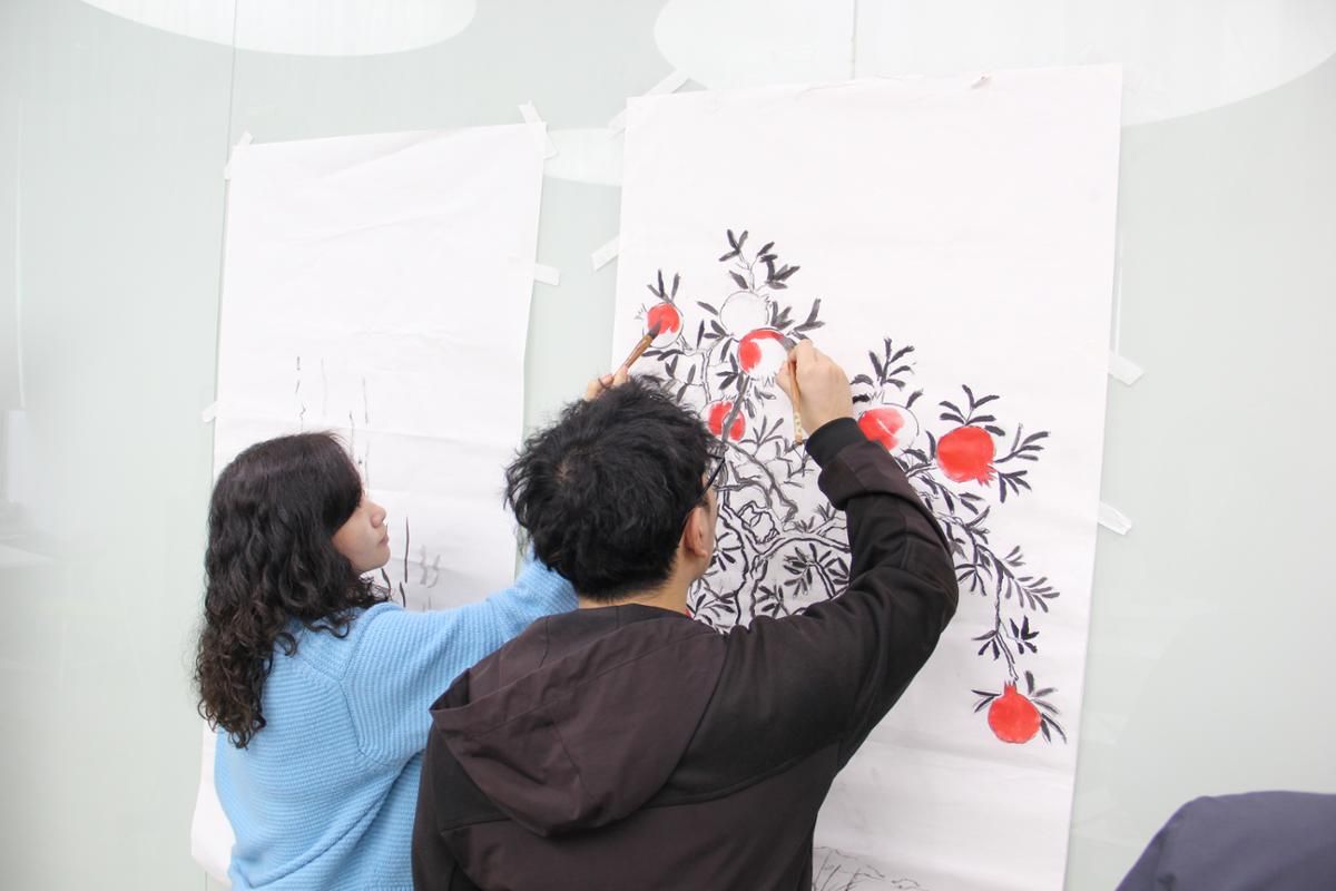 在绘制环节,各民族师生携手合作。同学们首先共同勾勒出石榴树粗壮的树干,坚实的笔触仿佛象征着民族团结的稳固根基。维吾尔族同学运用细腻的线条,精心描绘出繁茂的枝叶,将民族文化中对自然的热爱融入其中。哈萨克族同学大胆调色,渲染出石榴果的鲜艳色彩,为画作增添了浓郁的艺术氛围。大家相互学习,彼此提供创意灵感,将各民族的特色与智慧巧妙融入作品之中。现场氛围热烈而和谐,历时一小时,两幅《水墨石榴树》跃然纸上,水墨石榴树每片叶子的脉络里,都藏着各民族的智慧;每颗石榴籽的簇拥中,都透着“一起向未来”的决心。