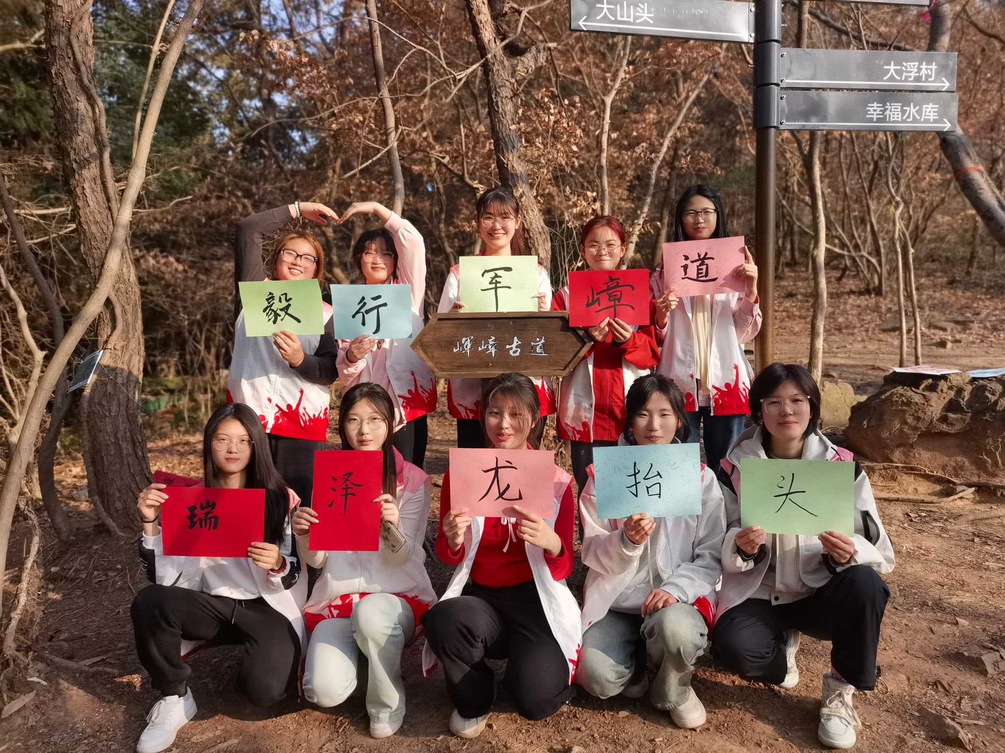 活动伊始,毅行社指导老师表示,军嶂古道是无锡的历史文化瑰宝,承载着厚重的历史记忆,希望同学们在行走中感受历史的脉搏,体会先人的智慧,同时挑战自我,磨练意志,收获团队协作的快乐。随后,全体参与者在老师的讲解下,深入了解了“无痕山林”理念及徒步注意事项,深刻认识到人与自然和谐共生的重要性,用行动诠释人与自然生命共同体的理念。徒步过程中,同学们不仅进行了环保捡拾活动,还进行了自然观察,从杉木、马尾松、枫香、杨梅树、香樟树、红盖鳞毛蕨、狗脊蕨、海金沙、阔叶鳞毛蕨、灰藓、到老鸦瓣,深刻感受到了军嶂古道的自然之美,在实践中增强了生态文明意识。活动进程过半时,开启了“二月二龙抬头”迎春书法会环节。同学们用毛笔、宣纸等工具,创作出了一幅幅充满春意的书法作品,表达了对自己新一年的美好祝愿,让文明传承的年轻心跳在纸墨香气中跃动。