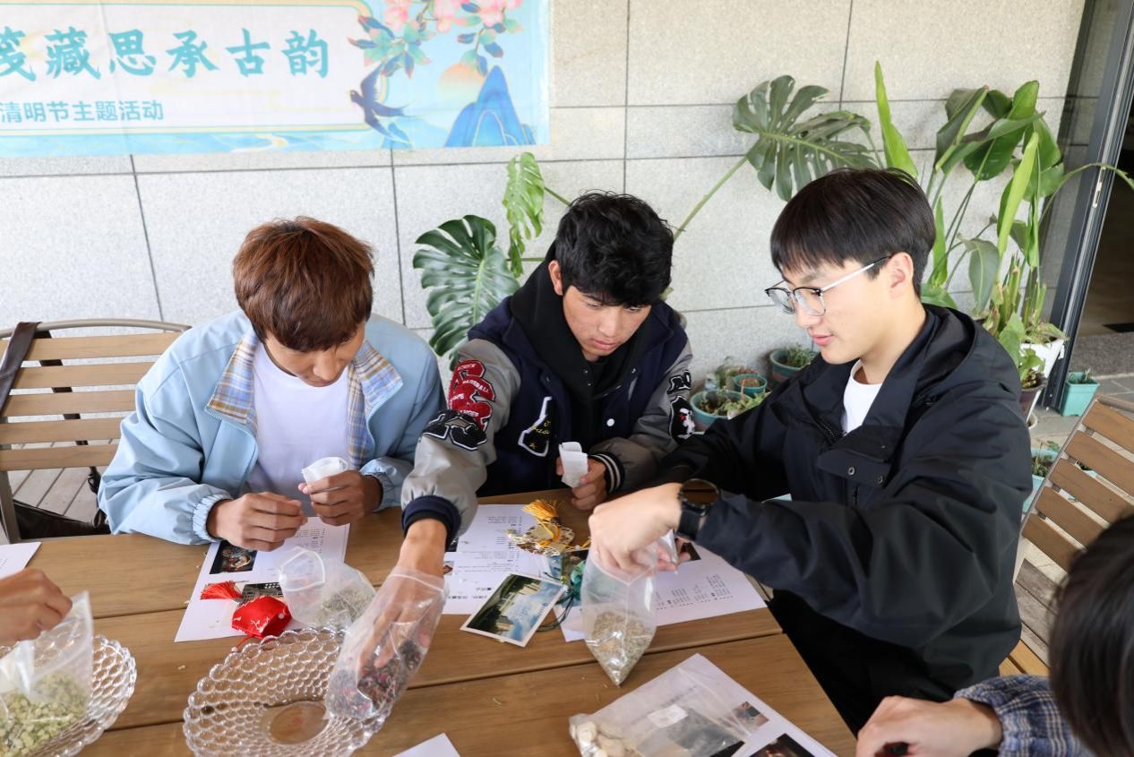 活动伊始,老师以温柔的话语为同学们开启了香囊文化之旅,从《诗经》中“容臭”的初现讲起,到汉魏时期香囊成为男女定情信物,再到如今传统节日里承载祈福安康的美好寓意,生动地讲述了香囊的前世今生随后,香包制作环节正式开始。桌上摆放着琳琅满目的香料,艾草的清新、丁香的馥郁、藿香的独特交织在一起,营造出宁静祥和的氛围。同学们三两成组,调配着属于自己的香气配方。这一捧捧精心搭配的香料,承载着同学们对传统香道文化的初次探索,也将缕缕清香编织进了清明的记忆里。