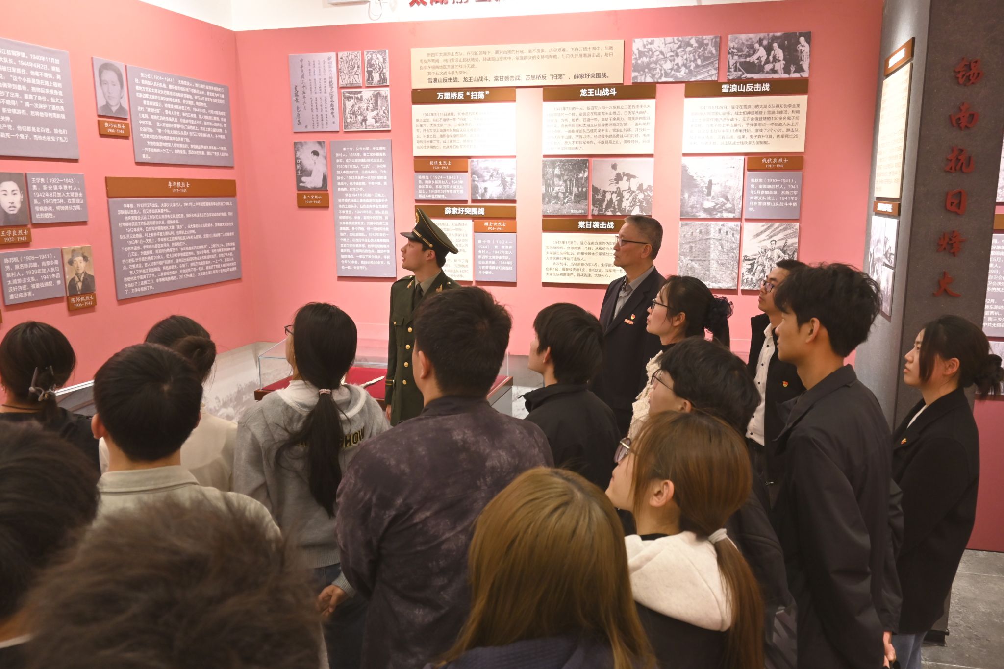 在讲解员的带领下,师生们走进锡南革命烈士纪念馆,通过一张张珍贵的历史照片、一件件斑驳的文物展品、一段段感人的英雄事迹,深入了解锡南地区革命先烈的奋斗历程。林姣姣老师结合展陈内容,以”传承红色基因,赓续精神血脉“为题讲授微团课,号召青年学子从红色历史中汲取精神养分,将个人理想融入国家发展伟业。在讨论环节,学生们就和平年代该如何接过先辈的旗帜,勇担重任展开深入讨论。“作为一名光荣的退役军人兼在校大学生,我深切地感受到烈士们用生命换来的,不仅是山河无恙,更是我们今天选择理想、追求光明的勇气。”学生代表周建感慨道。