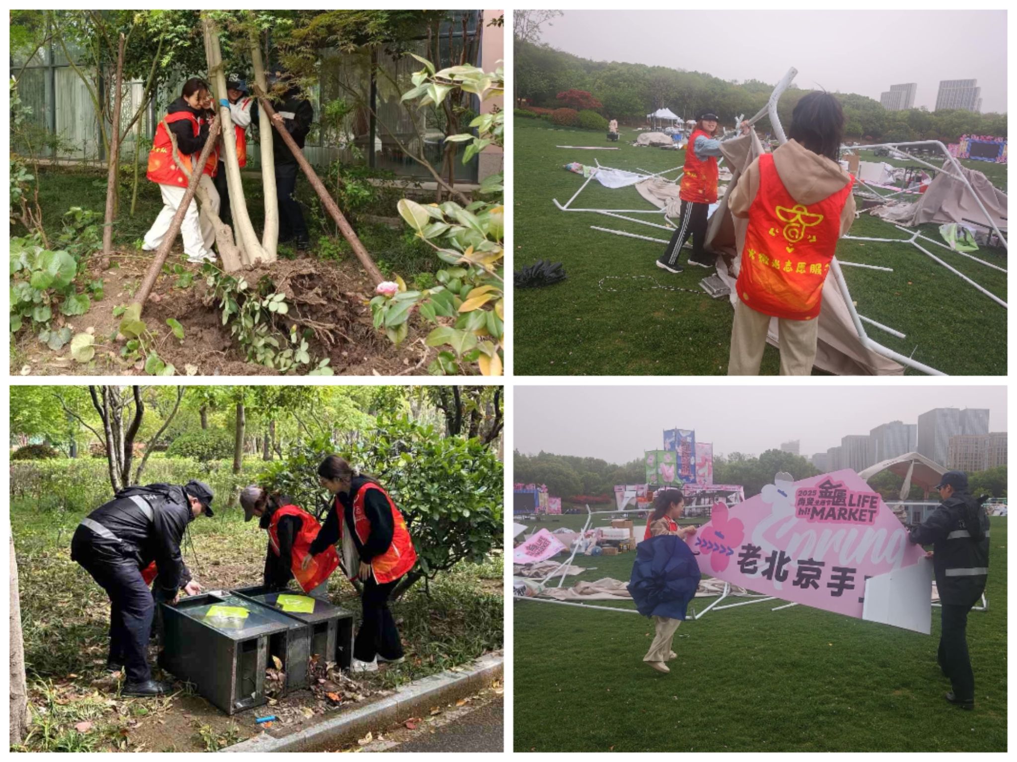 次日,无锡地区迎来7、8级大风,受风力影响,园区内导览设施倾倒、标识标牌散落、垃圾随风扩散,整体环境受到严重影响。志愿者们第一时间赶赴现场,在执法监督局人员指导下,围绕设施复位、垃圾清运及安全隐患排查分组开展环境恢复工作,倾倒的导览设施被扶起,散落的广告标识被复位,堆积的断枝落叶被固定,志愿者团队在短时间内完成主要区域环境和设施复位。