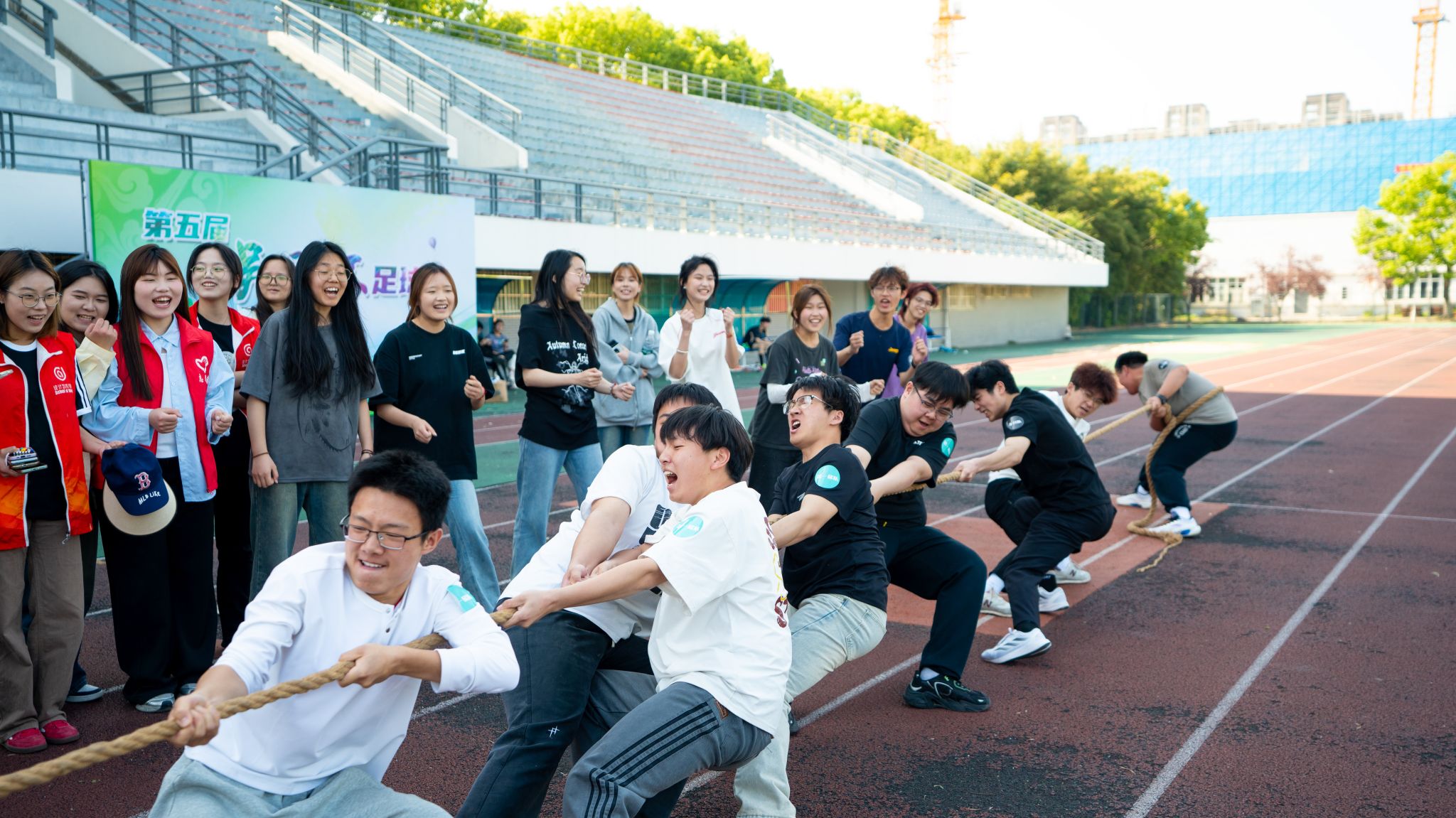 活动精心策划了包括“爱的魔力转圈圈”“熔岩过河”“抢水瓶”“拔河”“50*10接力”“东南西北跑”共6个集趣味性、运动性与协作性于一体的团体项目。采用“9+1”组队模式,每支队伍由9名学生与1名教师共同组成。活动当天天气闷热,但队员们个个精神抖擞,激情满怀,活动精彩纷呈,扣人心弦。“熔岩过河”项目,队员们脚踩指压板,大胆尝试各种方法,团结协作,出色迈向终点;“抢水瓶”环节,动感的《APT》前奏响起,九组队员排成两列站在水瓶的两侧,在“向左转、拍手、深蹲”等一系列动作指令后,音乐戛然而止,队员们如离弦之箭冲向水瓶……面对各种趣味挑战项目,师生们相互鼓励、彼此支持,共同克服困难。最激动人心的是拔河比赛,随着哨声响起,双方队员齐声呐喊,绳索在僵持中微微颤动,场边观众的加油声将气氛推向高潮。第一梯队凭借惊人的爆发力与持久的耐力,经过四轮晋级获得拔河单项目的冠军。经过2个多小时的激烈角逐,最终室内23323班、产品24322第一梯队、产品24321无名队分别斩获团体前三。