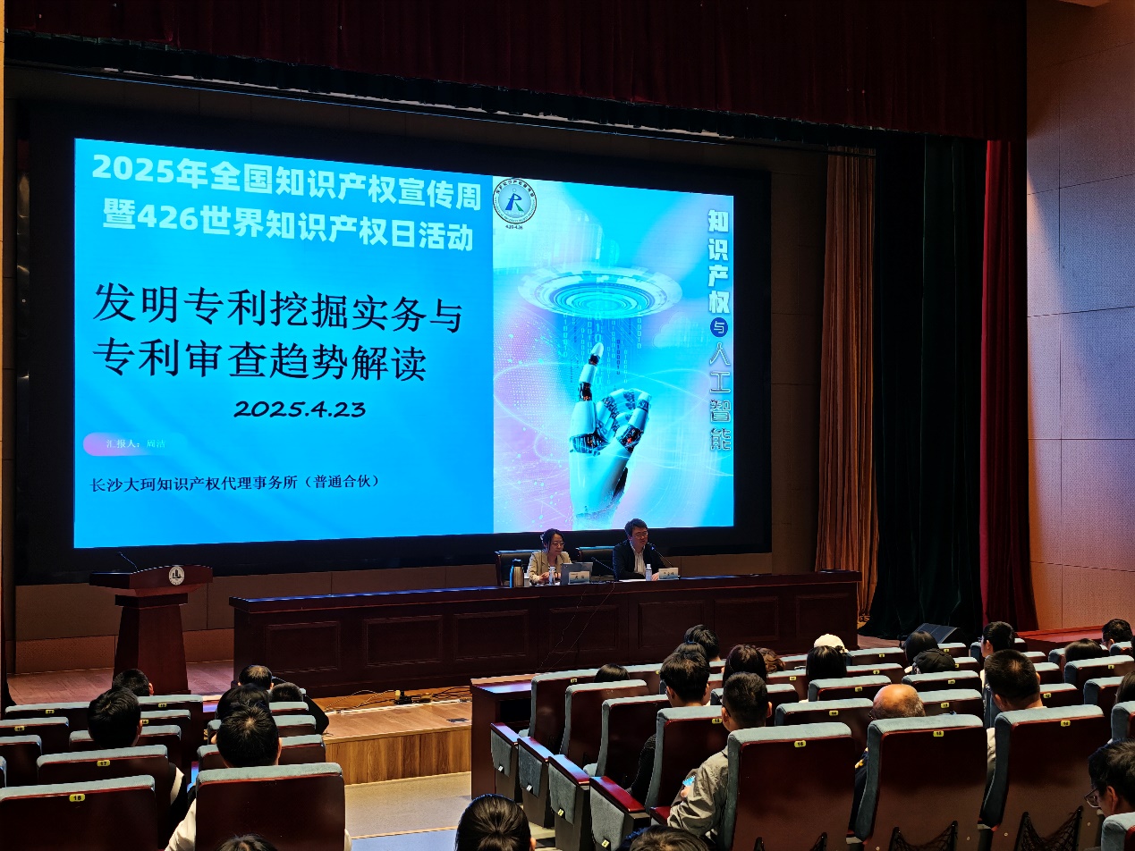 世界知识产权日到来之际,为强化我校师生对专利申请与知识产权保护的认知,进一步提升科技成果产出及转化的效率与质量,4 月 23 日下午,学校特邀长沙大珂知识产权代理事务所高级专利代理师周洁来校,在厚德楼一楼报告厅作以“发明专利挖掘实务与专利审查趋势解读”为题的专利讲座。本次讲座由科产处副处长于金程主持,各学院科研骨干教师、博士、科研秘书及创新班学生代表共 150 余人到场聆听。