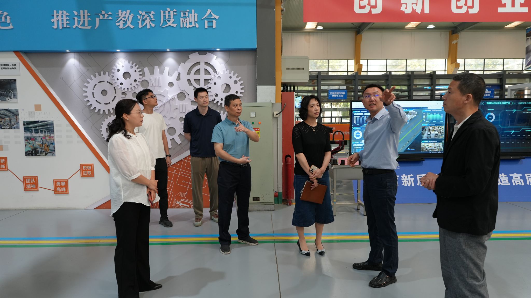 来访一行首先走进智能制造工程中心,院长刘全胜详细介绍了该产教融合集成平台在生产示范、技术研发、教学培训、服务企业智改数转等方面的具体应用,得到街道和社区领导的高度评价。