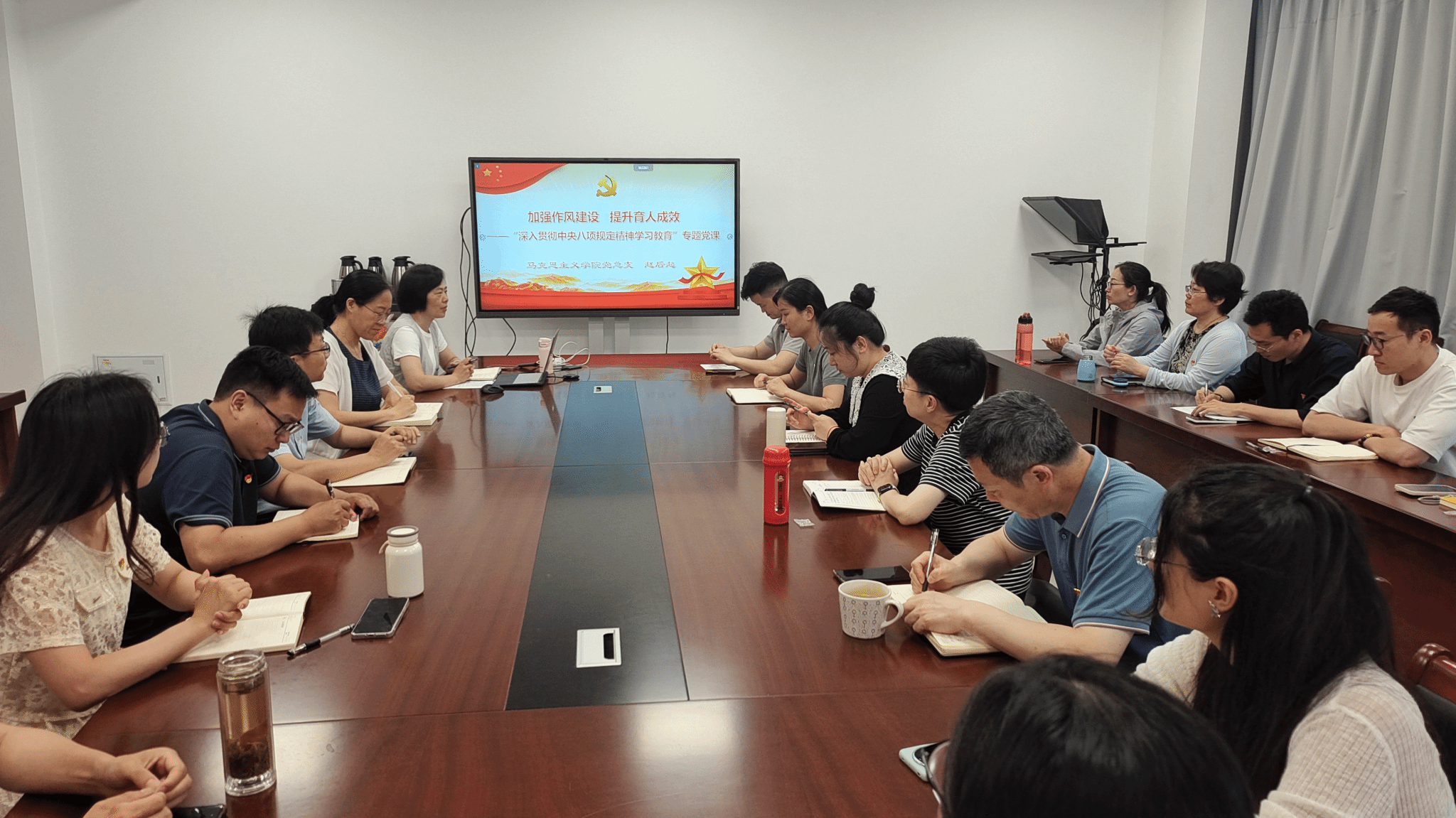 在本次主题党日活动前,马克思主义学院党总支书记赵后起在部门会议室面向总支全体党员讲授了以《加强作风建设、提升育人成效》为主题的专题党课,从延安作风建设说起,阐释了加强党的作风建设的重要性、党的作风建设的历史实践、中央八项规定精神及其实施成效,强调思政课教师要强化党性修养,筑实作风之基,恪守初心使命,培优教风学风,不断提升铸魂育人实效。