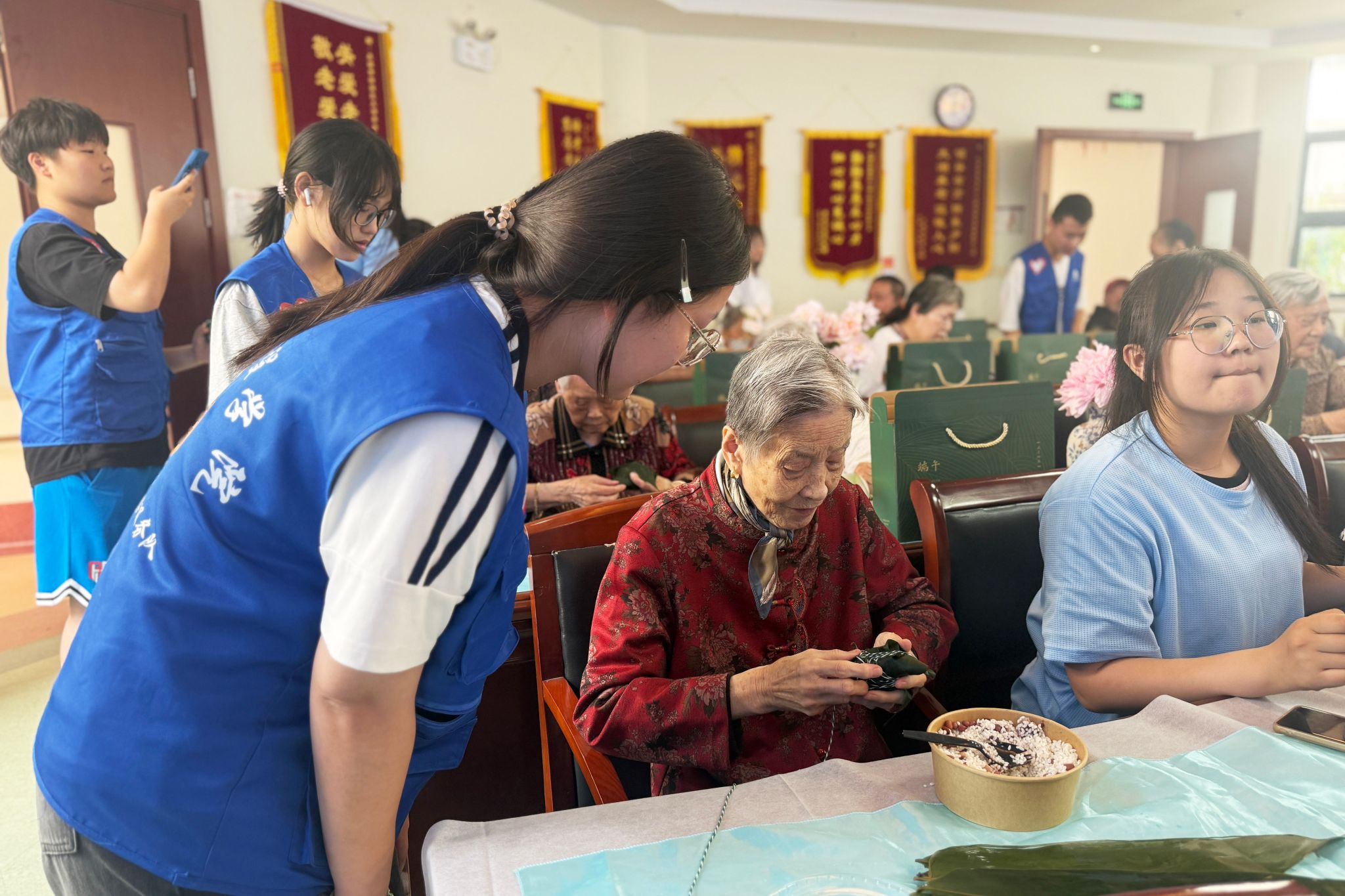 节目演罢,志愿者与老人们一起包了甜蜜的红豆糯米粽。一片片粽叶在大家手中翻飞,糯米、红枣等馅料被包裹其中,一个个形态各异的粽子逐渐成形。志愿者和老人们一边包粽子,一边交流着生活中的趣事,其乐融融。“爷爷奶奶对我们的演出和陪伴非常满意,让我深刻体会到尊老敬老的意义,未来我们会排演更多的文艺作品,以公益的形式回馈社会。”五月花海艺术团团长窦宇辰同学说。