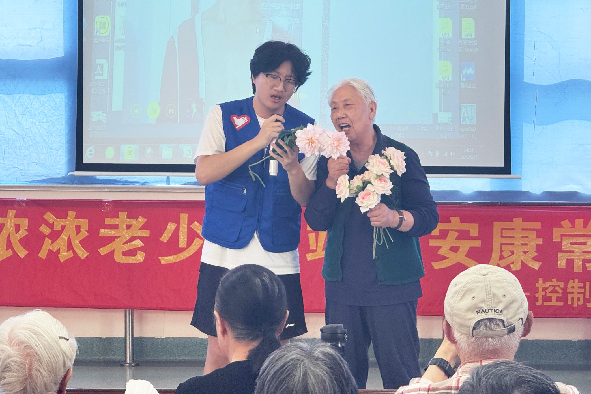 五月花海艺术团成员们精心准备的朗诵伴舞《如愿》,讲述了两弹一星功勋科学家们与现代人工智能、超级计算机技术工作者的时空对话,展现了当代青年勇担使命,传承老一辈科技工作者心愿的奋斗精神,赢得了老人们的高度评价。随后,大合唱《外婆的澎湖湾》将现场气氛推向高潮。熟悉的旋律响起,老人们纷纷跟着哼唱。谢贞云老人说:“孩子们的歌声,仿佛带她回到了美好的往昔时光。”她还点了一曲《搀扶》与志愿者合唱,老少两代人真情流露,现场掌声如雷。