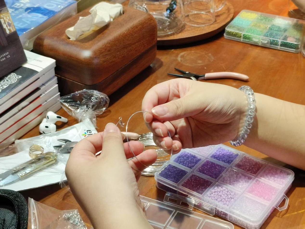 本次活动内容为手串DIY和扭扭棒玫瑰花环制作,手工作品完成后将通过学校“职此锡别”夜市面向毕业生进行义卖,希望给毕业生带来一份温馨而特别的毕业礼物。当天,“悦享她力量”手作疗愈所的负责人金梁琪同学围绕扭扭棒和手串制作展开知识讲解与示范;手串DIY小组的同学们仔细挑选珠子,精心设计自己的手串,不仅专注于作品的美观,更通过珠子的排列、配色和造型表达了自己的情感。另一组扭扭棒玫瑰花环制作小组的同学们则手指翻飞,将扭扭棒对折、弯曲,扭成一个个花瓣的形状,反复调整着花瓣的弧度与大小,制作成一朵朵颜色各异的玫瑰花,再将它们精心组合、固定到一起,制作出一个个承载着祝福与美好的花环。