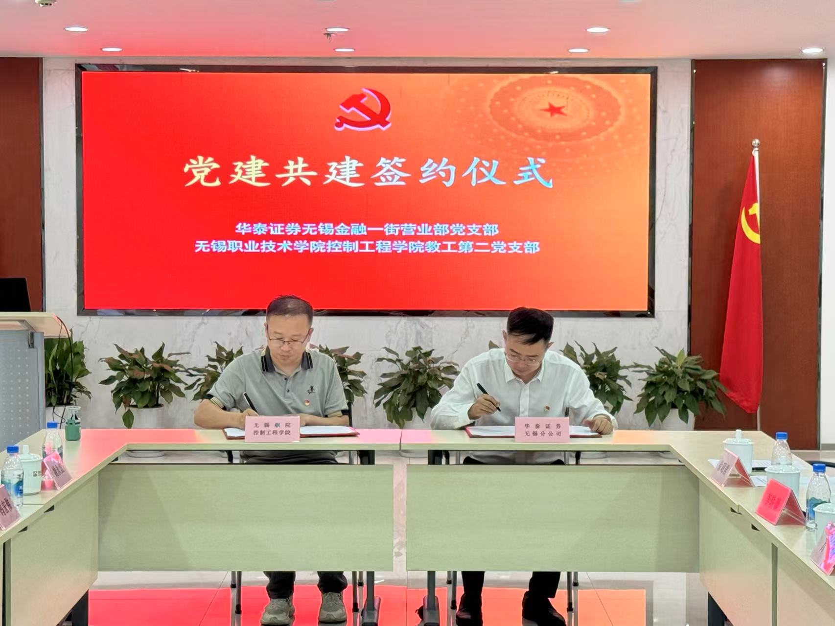 随后,双方领导围绕党建工作与业务发展进行了深入交流。在党建工作方面,双方就如何加强党组织建设、开展特色主题党日活动等问题进行了探讨;在业务合作方面,双方就人才培养、实习就业、企业服务等方面进行了深入交流,并达成了广泛共识。在热烈的掌声中,双方共同签署了党建共建协议。控制学院教工第二党支部与华泰证券无锡分公司金融一街营业部党支部一并签署了共建协议。