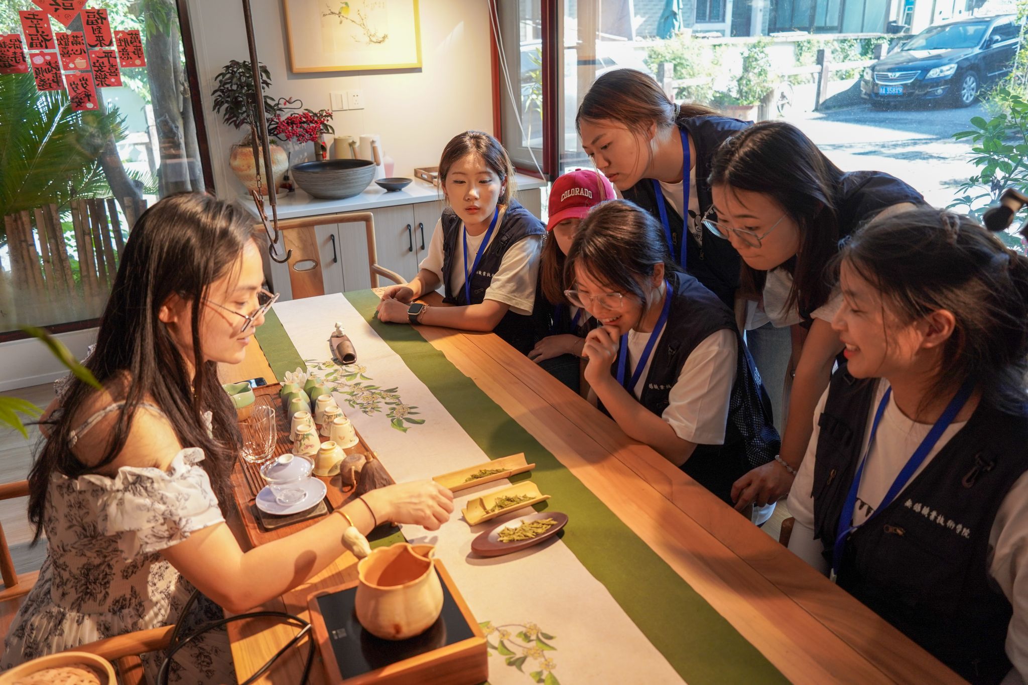 “茶叶蕴含着大自然赐予的养生智慧。”西湖龙井讲师马荷莎的现场科普介绍了优质茶叶中所富含的黄金成分——具有抗氧化能力的茶多酚、能舒缓情绪、减压的茶氨酸和提神醒脑的咖啡碱;品鉴环节,同学们闭目轻嗅,细细啜饮,“舌尖的苦涩与回甘交织,周围是茶叶的清香,有一种难以言喻的放松。”实践团成员杨雪晴感叹道,“感觉整个人身心都沉静了下来。”