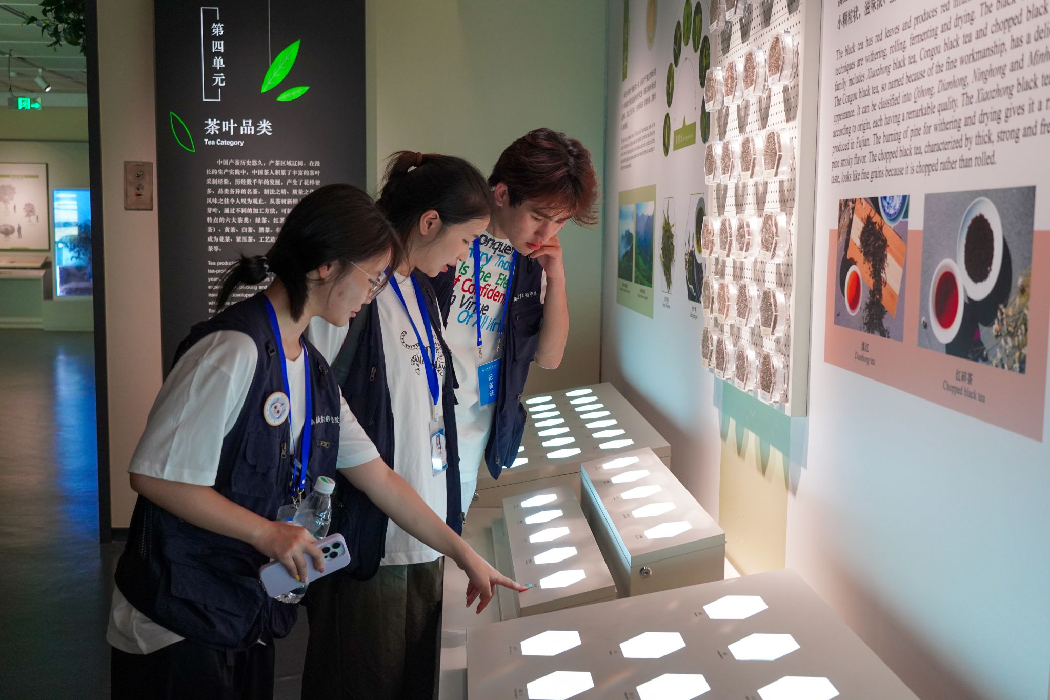 实践首站是中国茶叶博物馆。“茶史”“茶萃”“茶事”“茶具”“茶俗”五个主题展厅脉络清晰,系统勾勒出中国茶的千年发展轨迹;“茶与健康”板块通过视觉、听觉、嗅觉等体验,让科学知识不再枯燥,体感互动大屏前人头攒动,成员们跟着跳起活力操,在运动中加深对茶叶健康成分的了解。