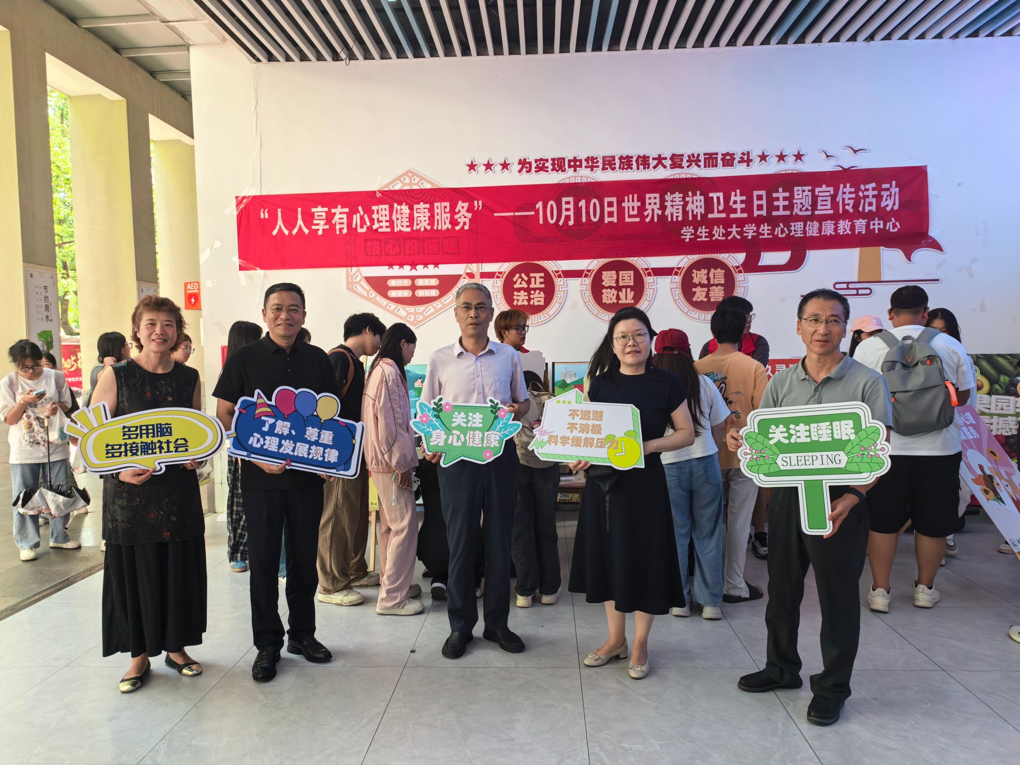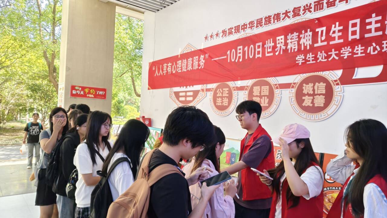 本次活动紧扣“人人享有心理健康服务”的主题,设计了答题互动环节,普及心理健康知识。师生在现场抽取涵盖“心理健康素养十条”内容的选择题,答对即可获得寓意心理健康的小纪念品。不少师生还主动手持印有心理健康知识的KT板合影,表达对校园心理健康建设的关注与支持。