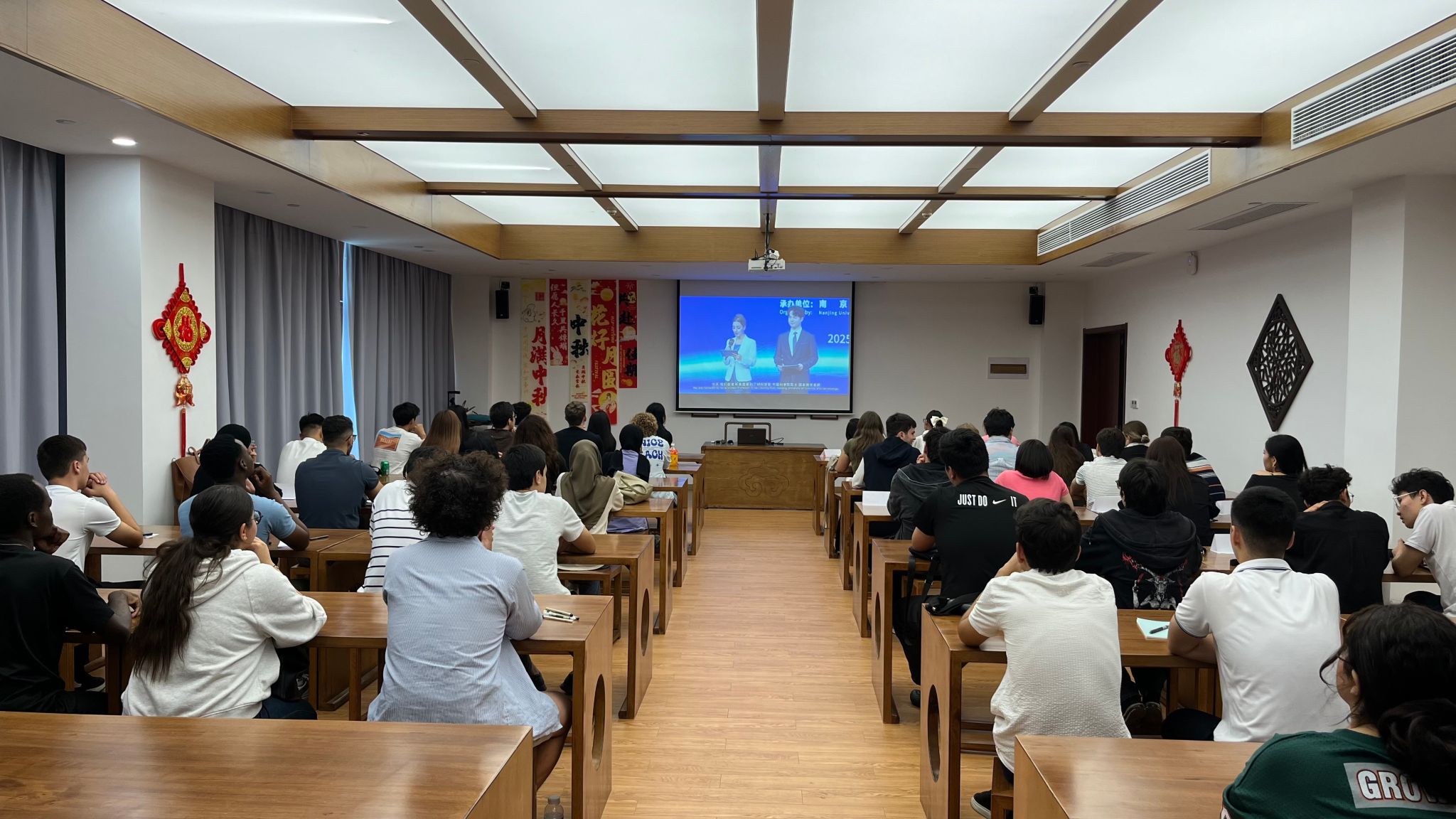 观看过程中,留学生们被江苏深厚的历史文化底蕴、蓬勃的创新发展活力以及优越的科教环境所吸引,从古老的大运河、精致的昆曲到现代化的智能制造、便捷的数字生活,视频为留学生们呈现了一个传统与现代交融的立体江苏。在院士讲堂环节,陈光院士为来华留学生们带来了生动的“开学第一课”,点燃了全场热情。他结合自身求学和指导留学生经历,从人文交流和学术探索角度出发,鼓励留学生积极融入、刻苦求学,促进中外文化交流。陈光寄语留学生,中国不仅是求学目的地,更是他们成长路上的第二故乡,一个永远感到温暖和自豪的“家”。南京理工大学巴基斯坦籍校友阿比德、南京中医药大学塔吉克斯坦籍校友李小龙分别作了在苏留学感悟分享。