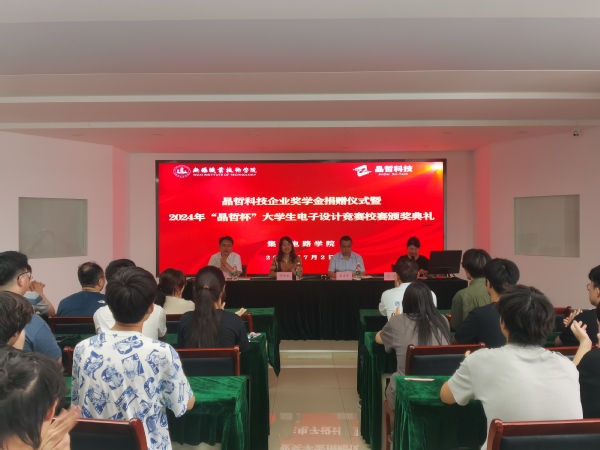 7月2日下午,集成电路学院在图文中心C-401,举行晶哲科技企业奖学金捐赠仪式暨2024年“晶哲杯”大学生电子设计竞赛校赛颁奖典礼。无锡晶哲科技有限公司总经理郭俊桃,集成电路学院院长蔡建军、副院长黄从贵、办公室主任、学工办主任、辅导员代表、获奖同学以及大一、大二各班级同学代表参加典礼。