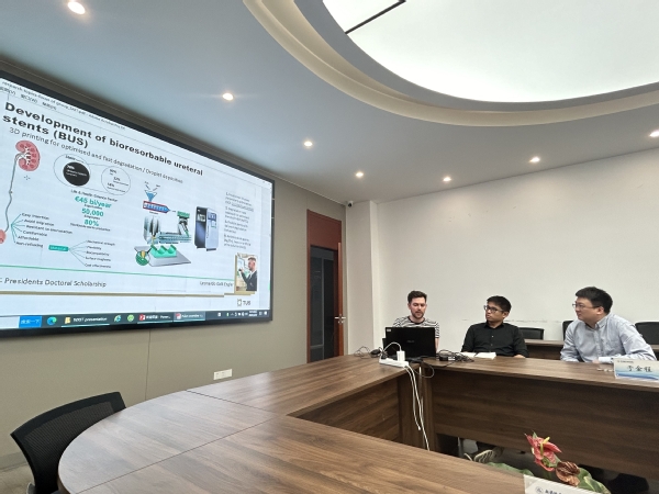 中外教师结合自身专业背景和研究方向,共同探索前沿课题,为我校的科研工作提供了新的思路和启示,推动了科研成果的产出,促进了学术交流与合作的深化。Dr Evert在机械学院会议室听取了李学星博士、樊博闻博士、孔文婷博士、马锦超博士的科技成果转化工作,给予高度赞赏,并针对四位博士开展的齿科种植精密检测、新型粉末冶金材料制备、表面超疏(亲)水材料开发、飞行器关键结构与运动控制等研究应用进行探讨。