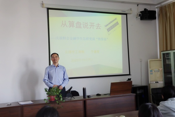 于建军以《从算盘说开去——浅谈财会金融学生怎样变成“铁算盘”》为题,深入浅出地讲解了财会金融学生应该具备的基本知识和核心技能以及新时代的“铁算盘”标准。他结合专业未来服务对象,深入分析了智慧财金人才在企业中的主要职责及未来的就业方向,为同学们展望了专业未来面临的挑战和发展方向。他鼓励同学们要端正学习态度、打牢理论基础、学好实际应用,有效激发自主学习的意识,找准自己的定位,用良好的基础铸造“铁算盘”;要积极培养诚信踏实的态度,努力将优秀的学习能力、工作能力和创新能力转化为个人的核心能力,用扎实的能力拨动“铁算盘”;要建立和谐的人际关系,发挥各种平台积极作用,参与内外有效实践活动,熟悉财会金融发展趋势,用明显的成效打好“铁算盘”。