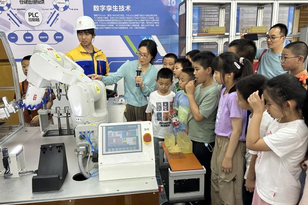 趣味科普课堂上,周丽老师带领同学们了解了学院增材制造、精密铸造、智能装备、工业视觉等实验室建设情况。职业体验课堂上,机电一体化技术专业主任唐霞老师带领创新团队学生成员,为同学们介绍了冬奥会飞扬火炬外壳打磨的科技,展示了自动导引小车运作、机械臂取材、数字模型和真实设备同步运行,让同学们了解了火炬打磨系统的出库、打磨、入库的全流程,同学们畅游在乐趣丰富的科技活动之中,感知科技的魅力。党史学习教育课堂上,学生第一党支部“红色讲解员”通过讲述建党与红船故事、播放视频“红色的故事”、红船手工制作等环节,推动学生党员当好“红船精神”的坚定捍卫者、忠实传承者、自觉践行者,在创新、奋斗、服务中学习实践中国共产党的建党精神,引导青少年听党话、感党恩、跟党走,树立理想,增长本领,立志成为社会主义建设者和接班人。