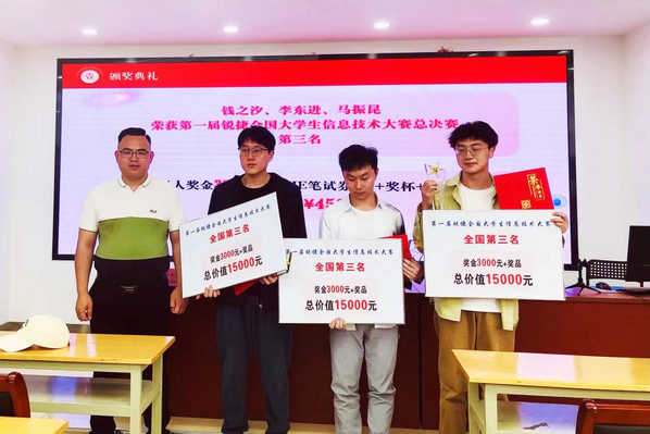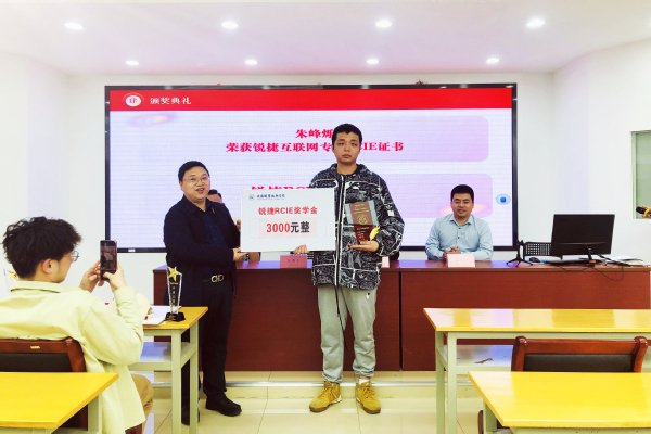与会嘉宾为获得第一届锐捷全国大学生信息技术大赛全国第三名团队的网络31932班钱之汐、李东进、马振昆颁奖,每位学生获得锐捷网络大赛奖金3000元、锐捷RCIE笔试券1张。物联网学院教师肖颖荣获优秀指导老师奖,学校荣获优秀组织奖。乐明于为我校首个考取锐捷顶级国际认证RCIE证书的网络32031班朱峰烁同学颁发奖学金3000元。最后,张红涛对2023年第二届锐捷网络大赛作了详细介绍。
