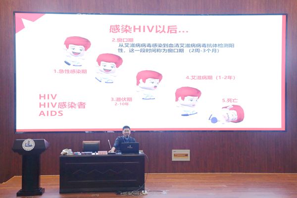 冯亚东老师首先通过营造轻松愉快的氛围向在场学生介绍了什么是艾滋病、如何预防艾滋病、学校艾滋病防控工作面临的挑战,同学们如何能够通过有效的方法预防艾滋病。其次,冯老师向同学们介绍了正规的艾滋病检测途径和咨询机构。在交流环节,机械技术学院志学部和心理部举行有奖竞答活动,以提问、互动的方式让在场的学生在轻松活泼的氛围中收获了防艾知识;文艺部同学倾情演唱世界艾滋病日公益推广歌曲《瞳孔里的太阳》,用歌声呼吁大学生要心怀大爱,关注艾滋病患者,关爱艾滋病儿童,给予他们更好的支持和接纳。