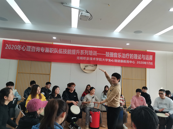 12月4日,中心邀请无锡城市职业技术学院心理中心负责人夏心怡、心理咨询师周利以及心理健康师周灵临老师为师生带来《鼓圈音乐治疗的理论与运用》,在热烈、和谐的氛围中,参与培训的师生获得愉悦、减压与调适。