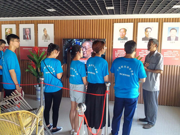 7月16日,蒲公英2018年暑期义务支教开班典礼在东王集中学举行,17日,同学们对东王集下辖合兴村进行了走访调研。参观合兴村建设历程后,同学们在村委会工作人员的带领下,参观了村民农家书屋。随后,在退休老党员王春雨同志的带领下,同学们参观了合兴村教育展览室,在这一方小小的展览室,承载着合兴人民的枪林弹雨战斗史、世代追梦的发展史、合兴儿女成长史以及村民践行社会主义核心价值观“三史一观”的文化传承和历史记忆。同学们还与合兴村委会工作人员就合兴村的建设进行了深入交流,并赠送给村委会《深入学习宣传贯彻党的十九大精神学习笔记》作纪念。