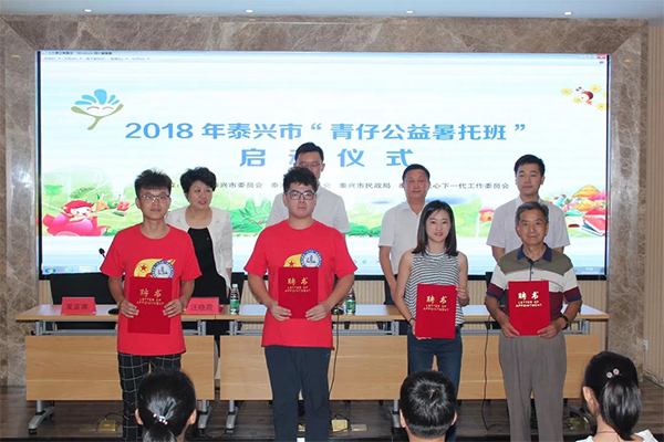 718日上午,泰兴团市委在姚王镇创业富民中心举办了“2018年青仔公益暑托班”启动仪式,仪式上一群“小红人”从团市委领导手中接过了大红聘书,成为姚王镇公益暑托班的老师。他们就是我校“蒲公英”支教联盟泰兴分队的志愿者们,这个暑假他们将陪伴这里的留守儿童一起度过。
