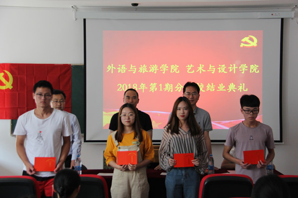 6月12日下午,外语与旅游学院·艺术与设计学院2018年第1期分党校结业典礼在国教406教室举行。外语与旅游学院党总支书记江铭、艺术与设计学院党总支书记罗嘉军、艺术与设计学院学生党支部书记蒋红中及培训学员40余人参加结业典礼。外语与旅游学院分党校负责人罗启宝主持结业典礼。