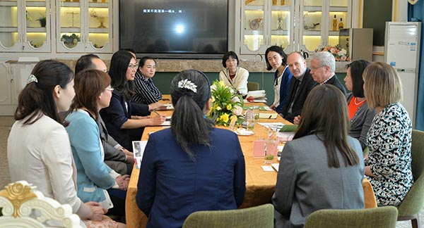 418日上午,美国万礼豪程项目总监董佳、首席资深学术顾问圣地亚哥州立大学教授Gene Lamke(杜靖德)、项目传讯总监兼教学顾问Linda Roundtree(袁诗琳)等一行6人来外语与旅游学院交流访问。