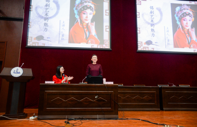 讲座中,董红老师从清末戏剧名画《同光十三绝》入手,介绍了戏剧的主要角色,详解了戏曲的三大表演体系,给同学们普及了戏曲的四功五法。董老师重点讲解了锡剧的历史发展进程,并用精彩的表演唱段,让同学们感受到锡剧“太湖一枝梅”(叶圣陶语)的独特魅力,设身处地领略到董老师扮相秀美俏丽、唱腔优美动听、表演惟妙惟肖的独特优点。