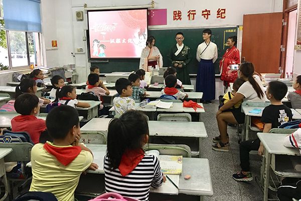 活动面向清和学校“放心班”孩子,汉服社成员用精心制作的课件向孩子们展示、介绍了汉服的样式风格、来源发展及背后的文化与智慧。随后,同学们帮孩子们穿上了典雅多样的儿童汉服,现场带领孩子们练习立容、坐容、行礼、迎宾等汉代礼仪,并在操场与孩子们跳起了汉舞。