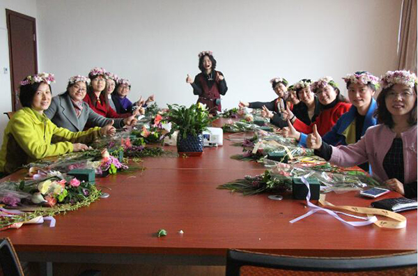 无锡著名花艺师——非常花店莉莉老师应邀现场教学,向大家介绍了花艺基础造型、花的流派、花型、花色等知识。随后,女教师们根据花艺师的讲解,结合自己的想法进行DIY设计。一个多小时之后,一个个充满创意的花环、花篮初具雏形。大家兴奋地互相观赏,交流心得。