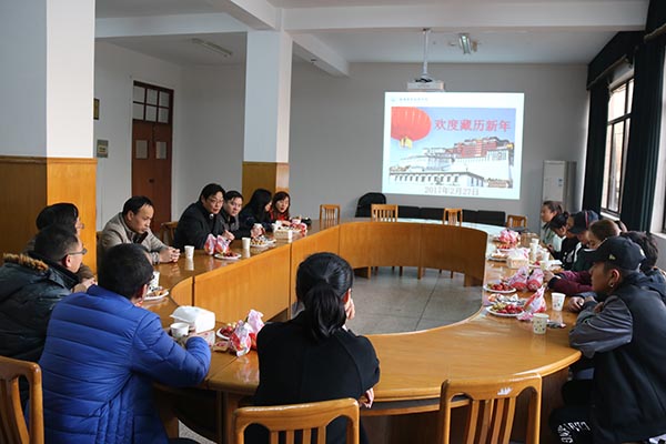 中桥管委会直属党支部书记张建忠老师向全体西藏少数民族同学致以新年的美好祝愿,希望大家与各民族同学一起努力学习,增进感情,为个人未来发展奠定良好基础,为和谐校园建设做出应有贡献。藏族同学代表米玛央珍表示,一学期的学习和生活得到了学校无微不至的关怀,让在异乡求学的他们感受到了家的温暖。门巴族同学桑杰次仁说到,师生间浓厚的情谊,汉藏同学间互相的关心帮助,都让他们深深地体会着生活的幸福和温暖,让他们在求学的道路上更有动力和信心,立志将自己磨练成对社会、对民族发展有所贡献的人。茶话会后,到场老师还与全体少数民族同学共进年夜饭。