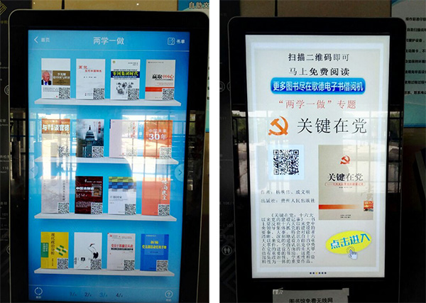 “两学一做”学习教育专题电子书架设在图书馆一楼大厅电子书借阅机上,共有55种相关图书,师生党员可扫描图书二维码,通过手机移动图书馆进行阅读学习。“两学一做”专题电子书架的设立,为全校党员的理论学习开辟了新的渠道与途径,充分发挥了图书馆资源在学校“两学一做”活动中的信息共享与推送作用。
