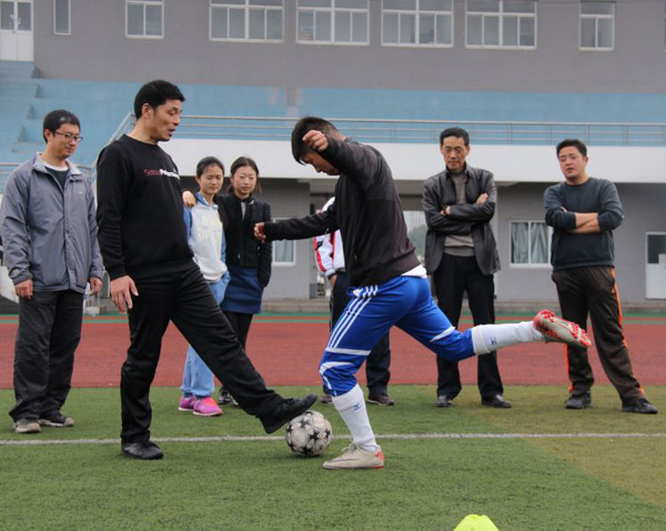 在室外讲解与示范环节,体育部副主任华宝元示范了体操垫上运动的成套动作,殷洁森老师示范了足球运球绕桩的测试内容,其他老师也纷纷上阵,在加强理论知识的基础之上结合实践。