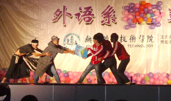 晚会在吉他合奏中揭开序幕,歌舞、相声、武术、话剧、走秀等多类型节目精彩纷呈,现场观众反响热烈,兴致高昂。哑剧《我的中国心》,结合当前学生广泛关心的钓鱼岛问题,激发了学生的爱国热情,当“钓鱼岛是中国的!”呼声响彻大厅时,现场观众掌声雷动。男女反串版的《新牛郎织女》新颖搞怪、造型别致,令现场观众捧腹大笑。本场晚会还创新采用人人网状态墙的方式,及时反馈学生观后感和动态,受到大家的欢迎。(赵癸萍 杭丽媛)