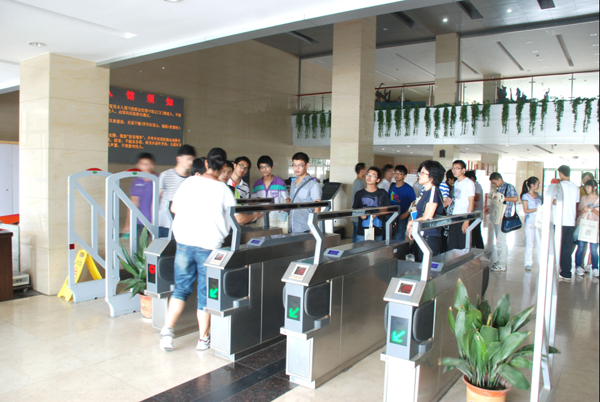 工作人员引导新生通过图书馆门禁刷卡入馆