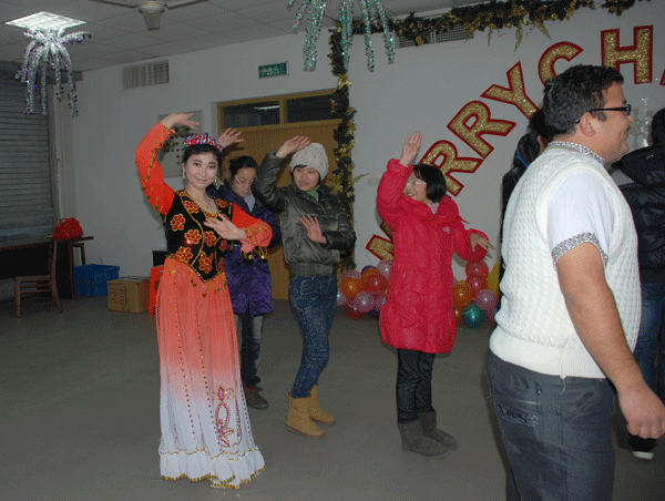 活动中,并由图文信息中心姜敏凤、陆丹晨老师对2011年优秀图书馆志愿者、优秀学生馆员、年借阅量排名前十位的“2011年借阅之星”和“图书馆勤工助学学生业务技能大赛”获奖同学颁发证书,进行表彰奖励。随后志愿者、勤工助学同学、热心读者和新疆培训班学员表演了精彩的文艺节目,富有特色的少数民族舞蹈激起了同学们的兴趣,大家纷纷上台学了起来,这一环节也将联欢活动推向高潮。(图书馆 王继红)