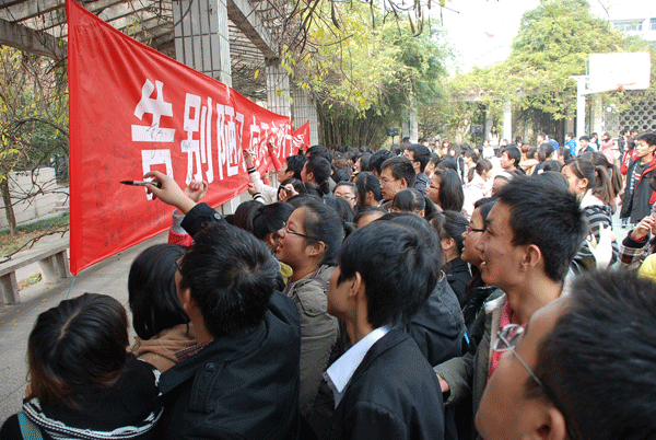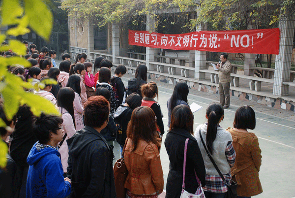 11月23日中午,经管学院在西篮球场召开大学生文明礼仪誓师大会,学生办主任丁正荣在会上进行了动员。经管学院20个班近900 名学生参加了这次大会,并进行了大学生文明礼仪的庄严宣誓,递交了文明礼仪承诺书。学生们还在《告别陋习,向不文明行为说:“NO”》的条幅上签了名。