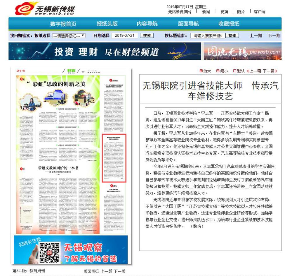 【无锡日报】无锡职院引进省技能大师 传承汽车维修技艺