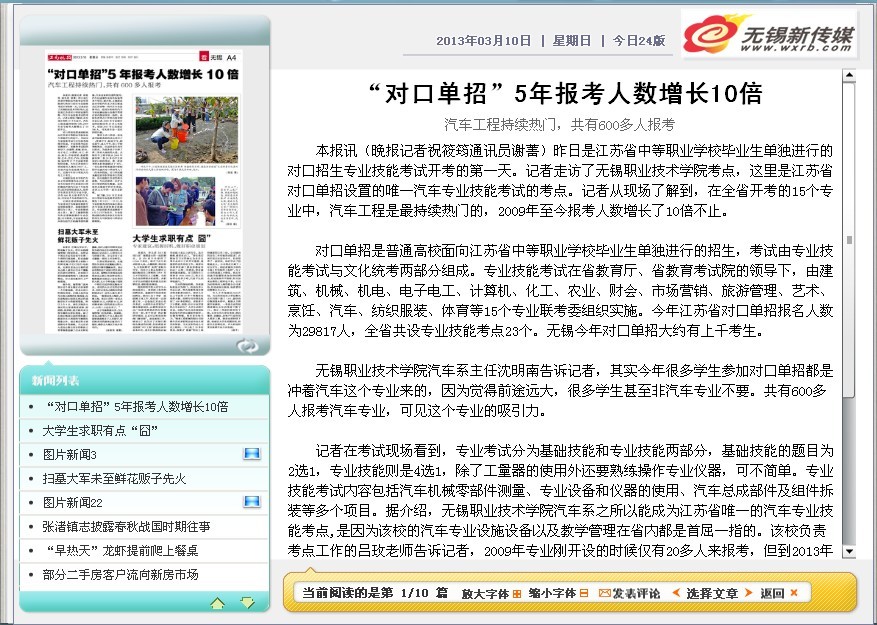 本报讯(晚报记者 祝晓筠 通讯员 谢菁)昨日是江苏省中等职业学校毕业生单独进行的对口招生专业技能考试开考的第一天。记者走访了星空app官网考点,这里是江苏省对口单招设置的唯一汽车专业技能考试的考点。记者从现场了解到,在全省开考的15个专业中,汽车工程是最持续热门的,2009年至今报考人数增长了10倍不止。