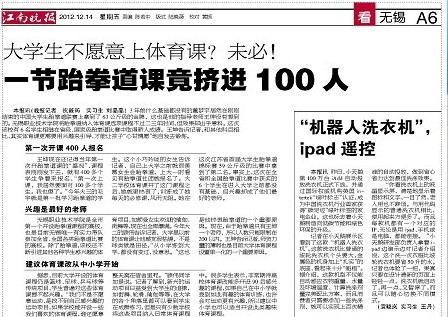 王坤现在还记得当年第一次开跆拳道课的“盛况”,课程表刚刚发下去,就有400多个学生争着来报名,“第一次上课,我居然要面对100多个学生。我也傻了。”今年大三的毛宇就是第一批学习跆拳道的学生。这个小巧玲珑的女生告诉记者,自己上大学之前就很羡慕女生会跆拳道,上大一时看见有跆拳道社团就报名了。大二学校体育课开了这门课程之后,她就更热衷了,训练成了她每天的必修课,风雨无阻。她在这次江苏省首届大学生跆拳道锦标赛59公斤级的比赛中拿到了第二名。事实上,这次在全省和全国跆拳道比赛中获奖的6个学生在进入大学之前都没有基础,但兴趣却成了他们最好的老师。
