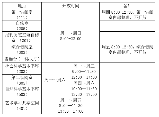 (1)开放时间:周一到周日8:00-22:00,具体库室开放安排如下: