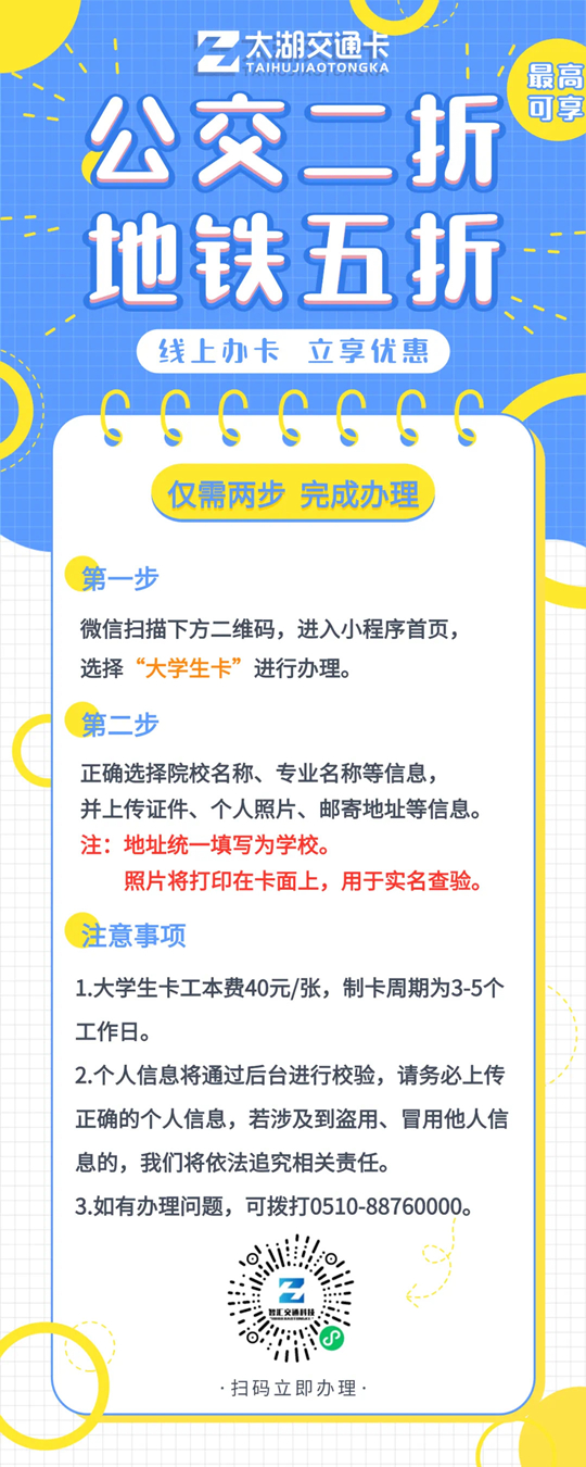 为进一步服务广大学生,无锡太湖交通卡有限公司将进校集中办理太湖交通卡“大中专院校学生卡”(以下简称“大学生卡”),具体通知如下: