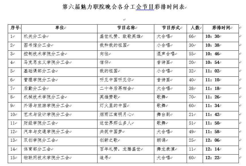 第六届“魅力职院”迎新年师生文艺联欢会即将于12月28日下午14:30在无锡大剧院举办,现将节目彩排时间安排通知如下,请各单位于28日上午组织演员赴现场彩排,每个节目彩排时间为8分钟。