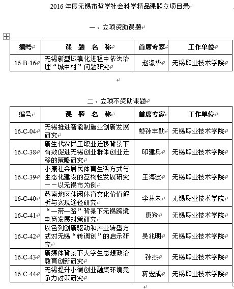 各部门、各单位: 近日,无锡市哲学社会科学界联合会发布了通知(锡社字〔2016〕6号),通知公布了2016年度无锡市哲学社会科学课题的立项名单,我校获得9项课题立项。现将课题立项通知转发于你们,请相关部门按照通知要求督促课题负责人按时完成结题材料。 科技产业处 2016年6月13日