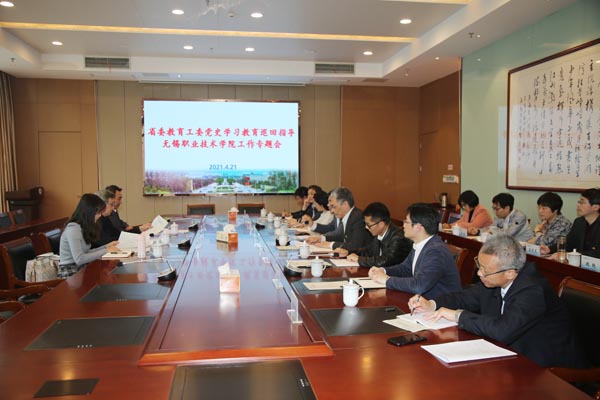 4月21日下午,省委教育工委党史学习教育第三巡回指导组副组长、江苏联合职业技术学院原院长晏仲超一行3人来我校指导党史学习教育工作。校党史学习教育领导小组及办公室成员参加了汇报会。