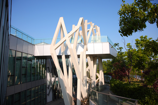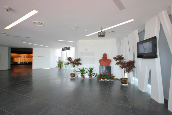 步入美术馆大厅,程及先生的半身塑像淡然矗立,14分钟的专题纪录片,向人们讲述着大师的艺术人生。多媒体技术呈现在白色背景墙上的枫叶缓缓飘落,映衬落地玻璃幕墙外抽象的树枝,寄予程及思念故乡、落叶归根的思绪,意境悠远。地上和地下的两个主、次展厅,均采用不规则设计,小巧而富有艺术感,可一次性陈列书画作品30余幅,程及先生捐赠的80多幅作品在此轮流展出。展厅配备的自动感应灯光,只有当观众靠近展品时,灯光才会慢慢启动,既节约了能源也有利于作品保护。综合展厅则作为国内外著名画家交流展览所用,作品展示厅和库房还配置了恒温恒湿设施和安全装置。创作办公区设有四个可供研究、交流的艺术创作室,观众休息区还有咖啡茶社、休闲茶吧。在一楼与平台眺湖区的连接处,采用了阳光天井的设计概念,自然光有效补充了内部照明,同时使得美术馆更加通透和富于现代感。